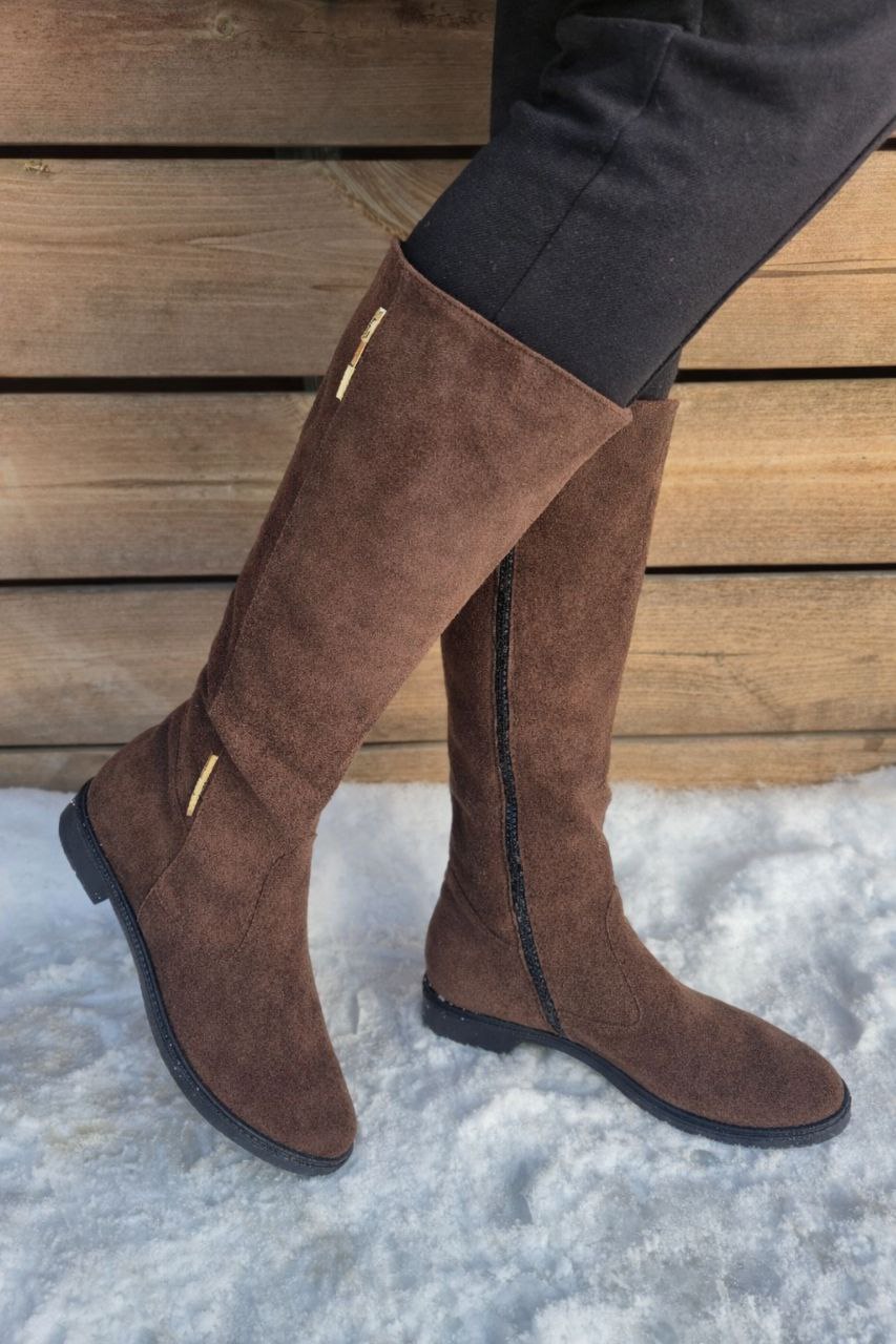 Коричневі замшеві демісезонні жіночі чоботи на байці